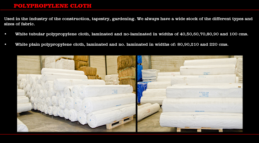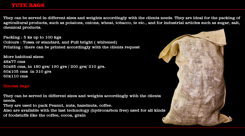 Our company is specialist, not only in the importation of polypropilene Bags, but also in all types of JUMBO/BIG BAGS, duly homologated, and also in importation of any product in jute material, Jute cloth, Jute sheets, Jute bags, Jute yarn, etc